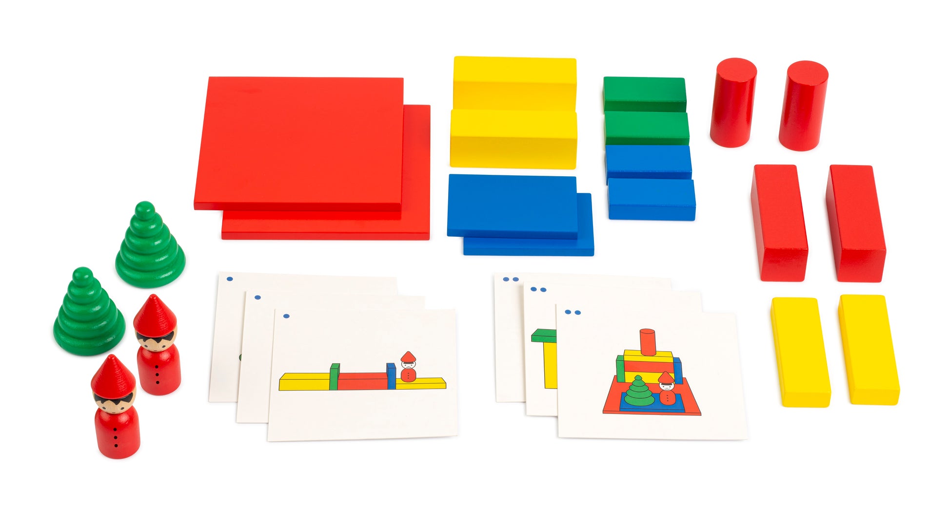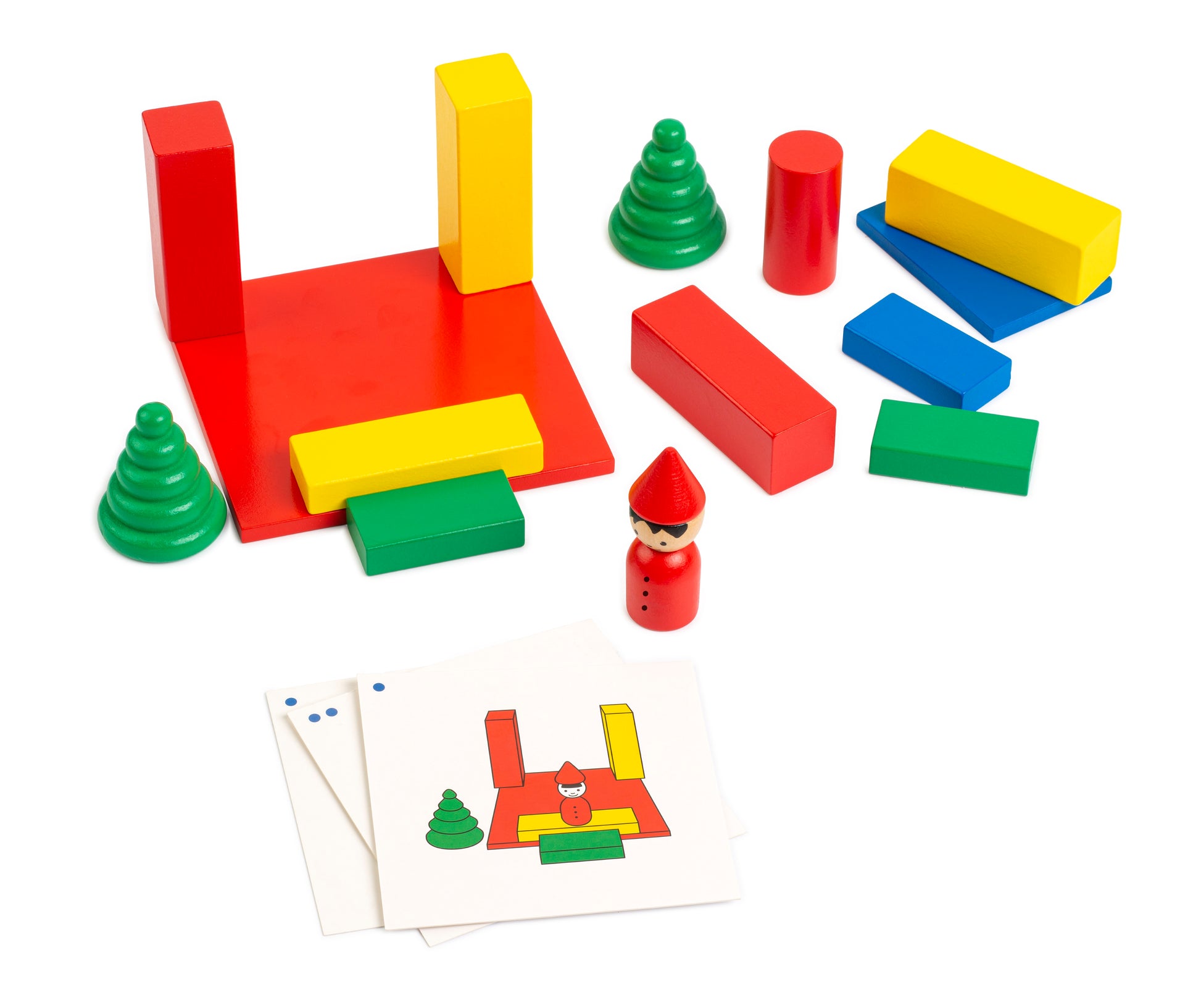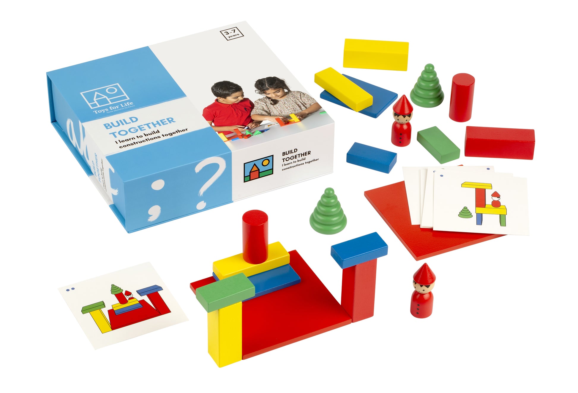 Cooperate and build constructions following assignment card images or create own designs. Give one another verbal instructions such as "Put the red block on the green one". Stimulate communication, teamwork and creativity.