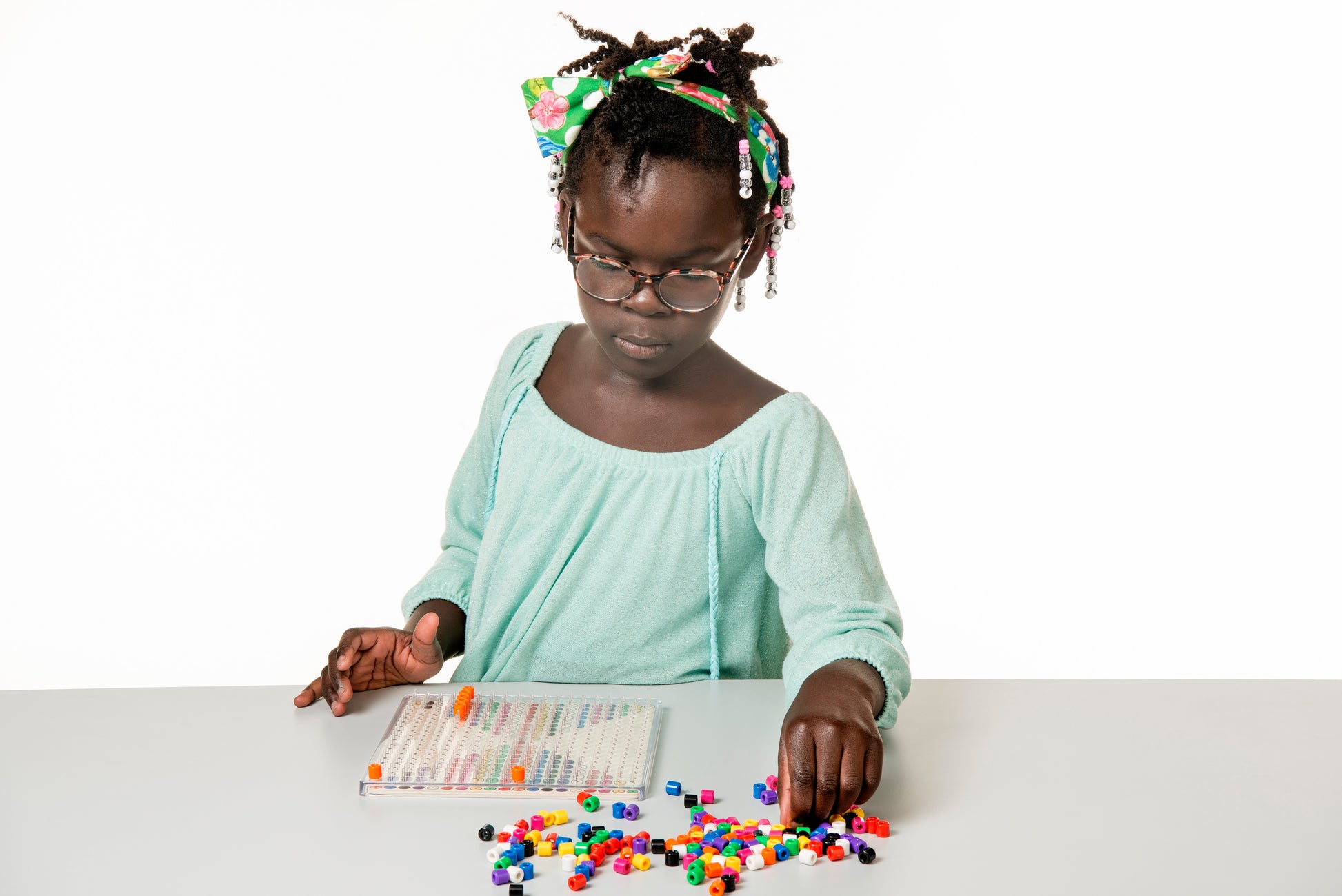 Make colourful patterns with beads. Place a transparent bead board on or next to an image card and add the beads. Stimulates hand-eye coordination, spatial awareness and creativity.