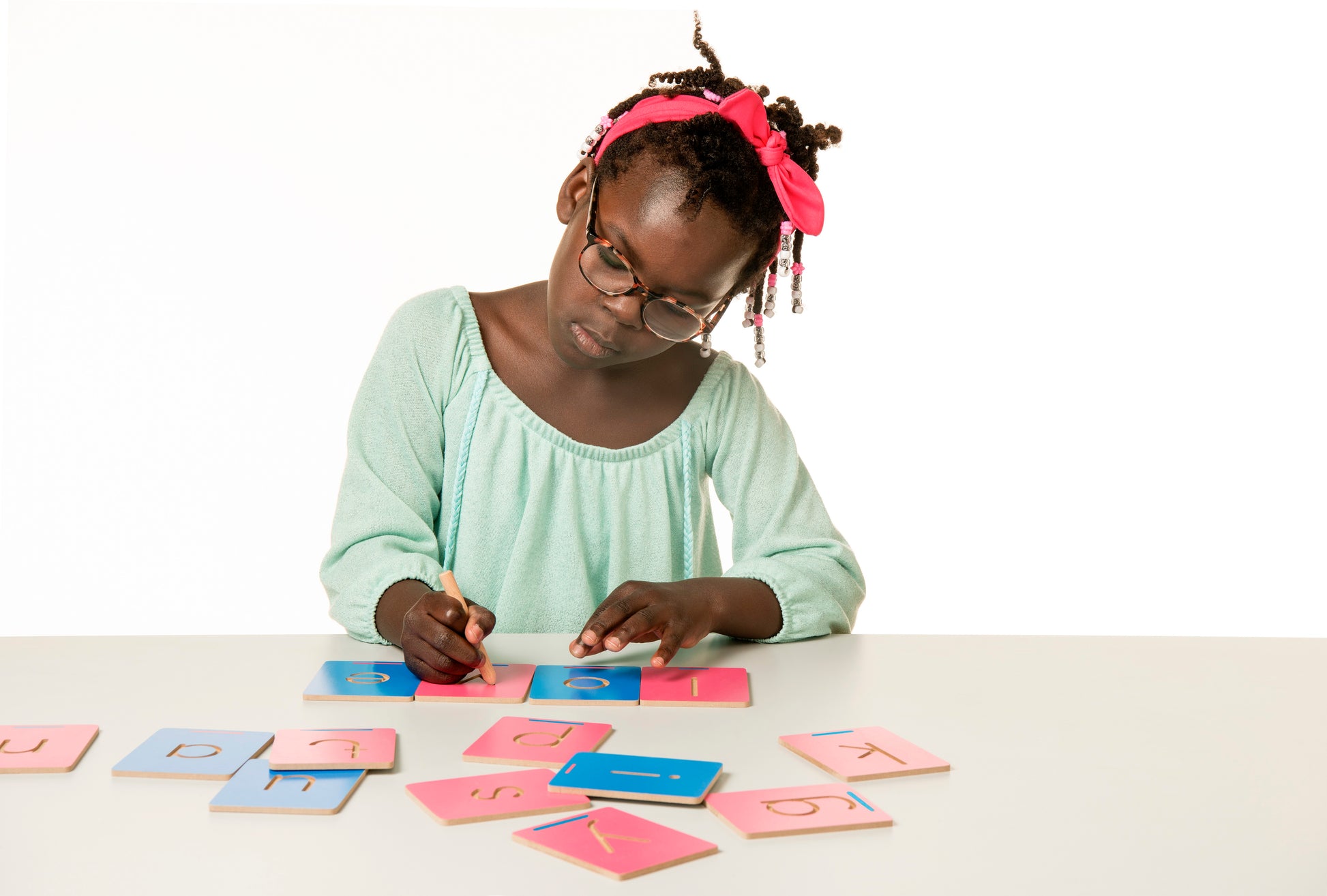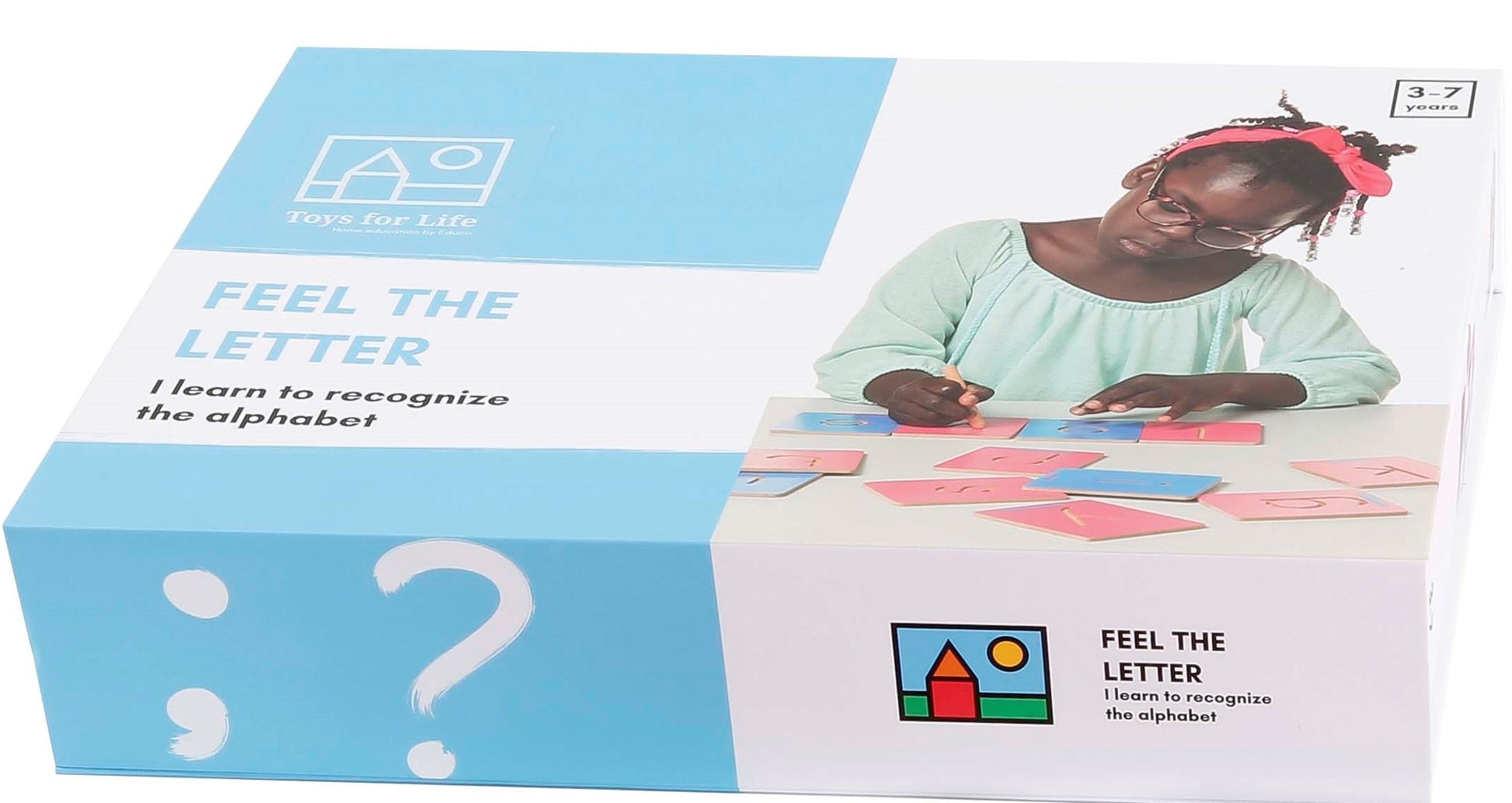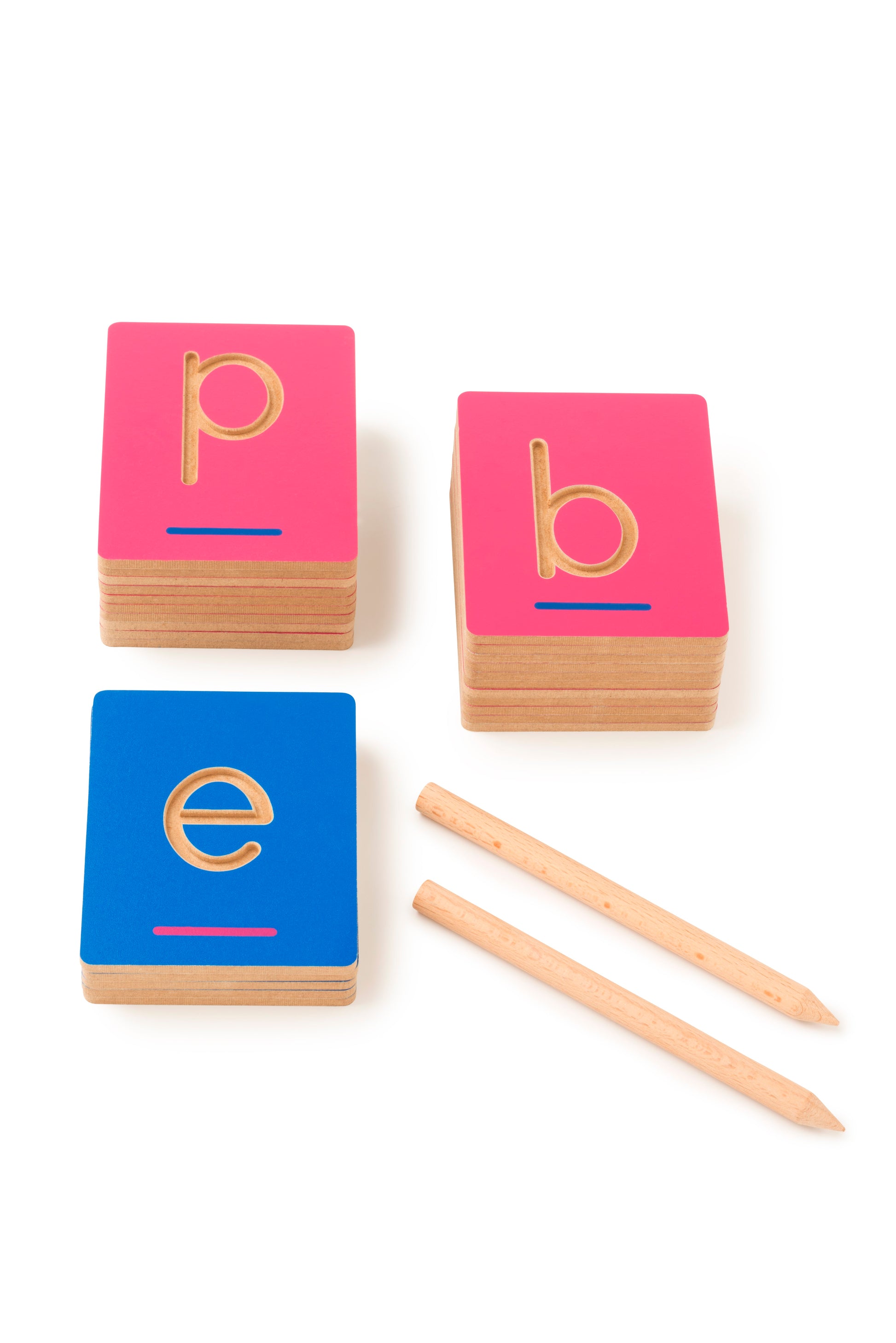 Follow letter shapes with your index finger or the wooden pen. Stimulates pre-writing skills, letter shape recognition and fine motor skills.