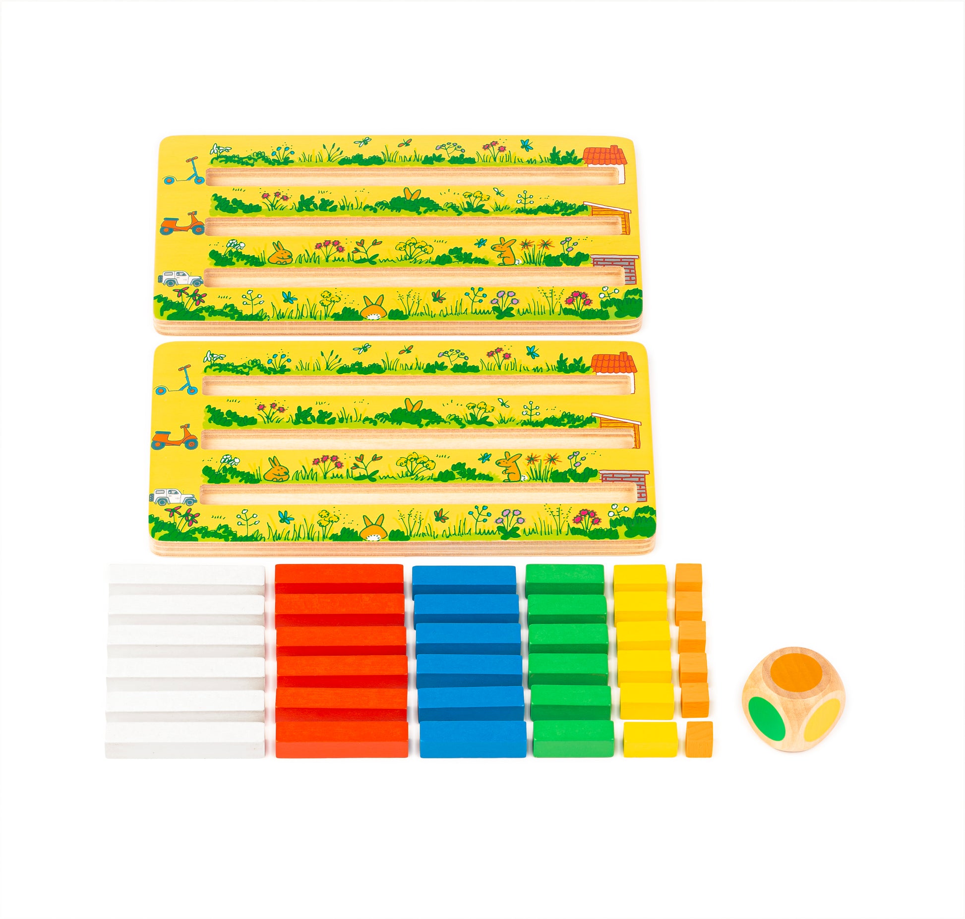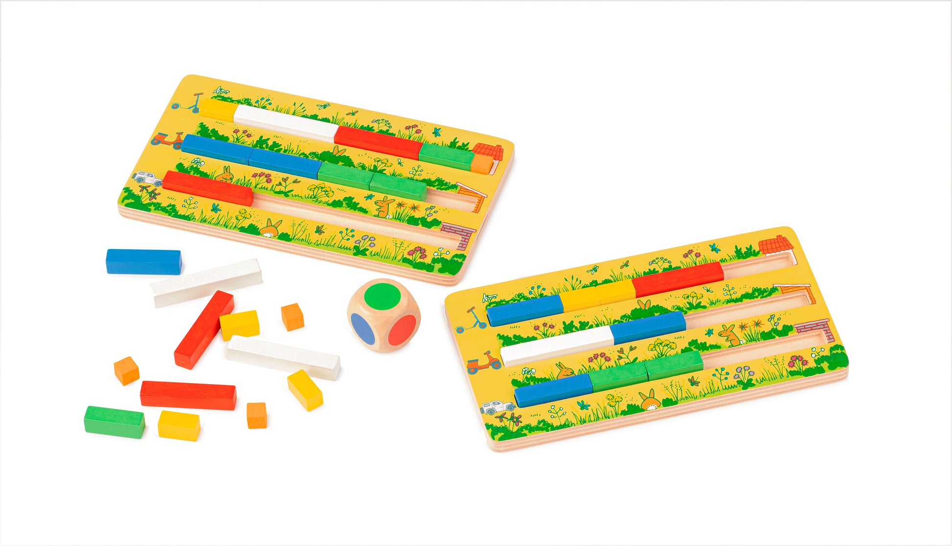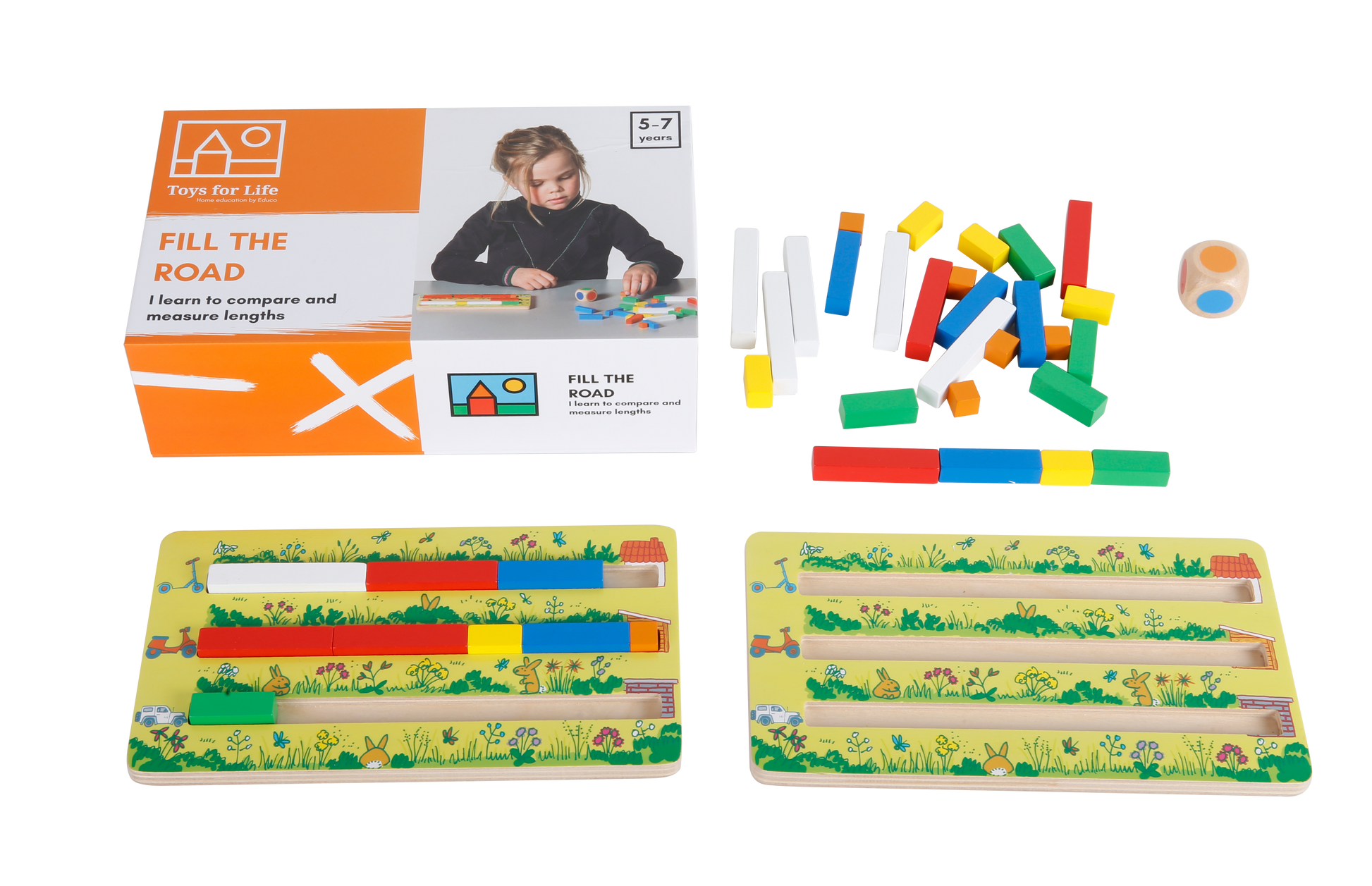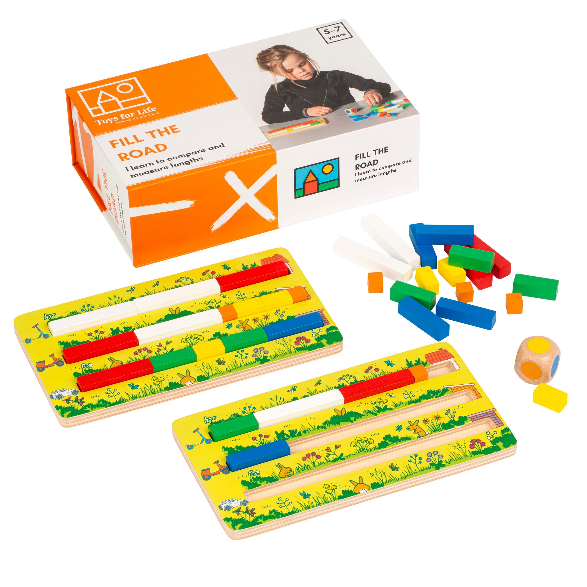 Fill the roads by placing blocks of different lengths in the workboard. Practice fitting, measuring, comparing, and swapping lengths