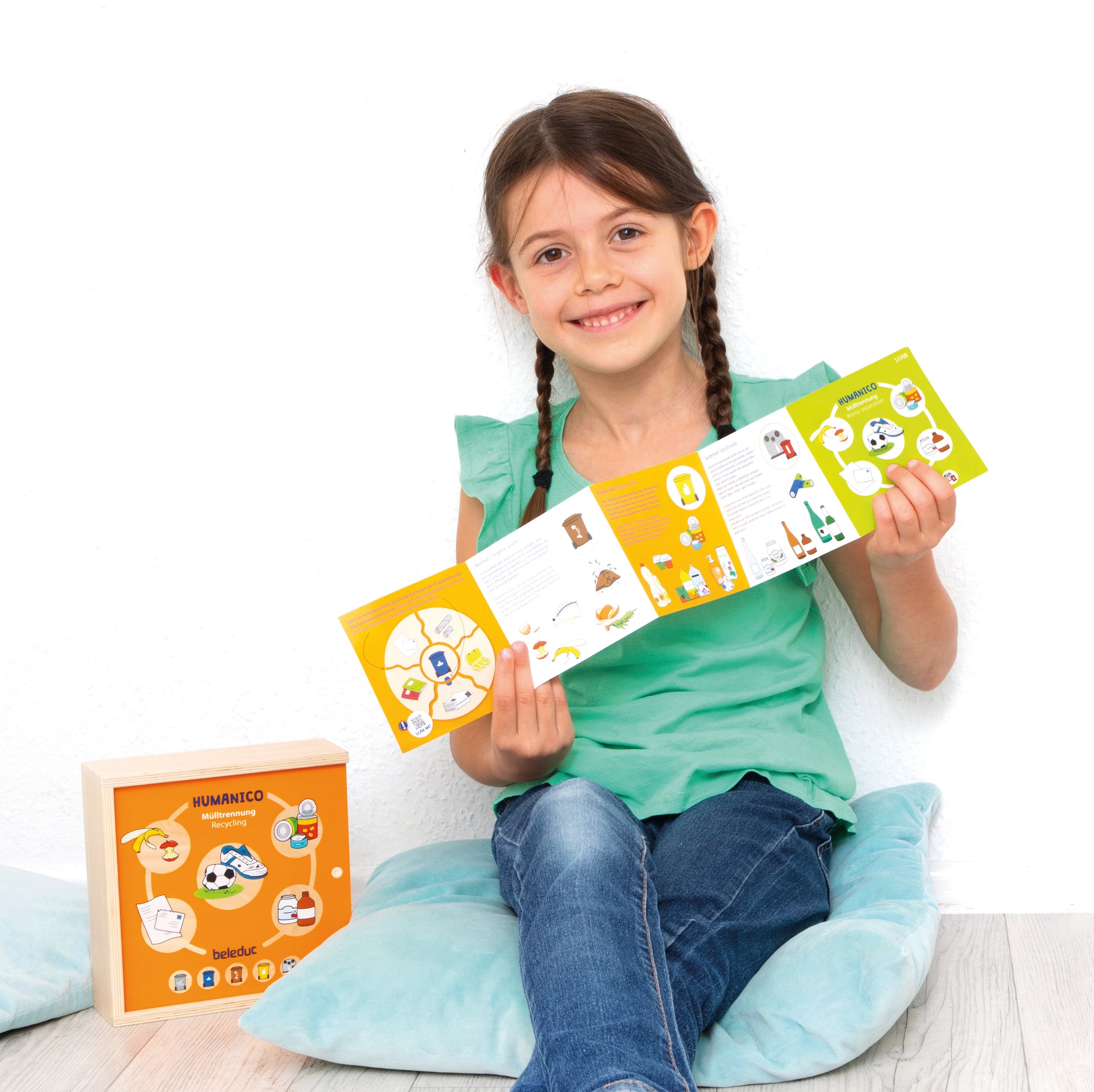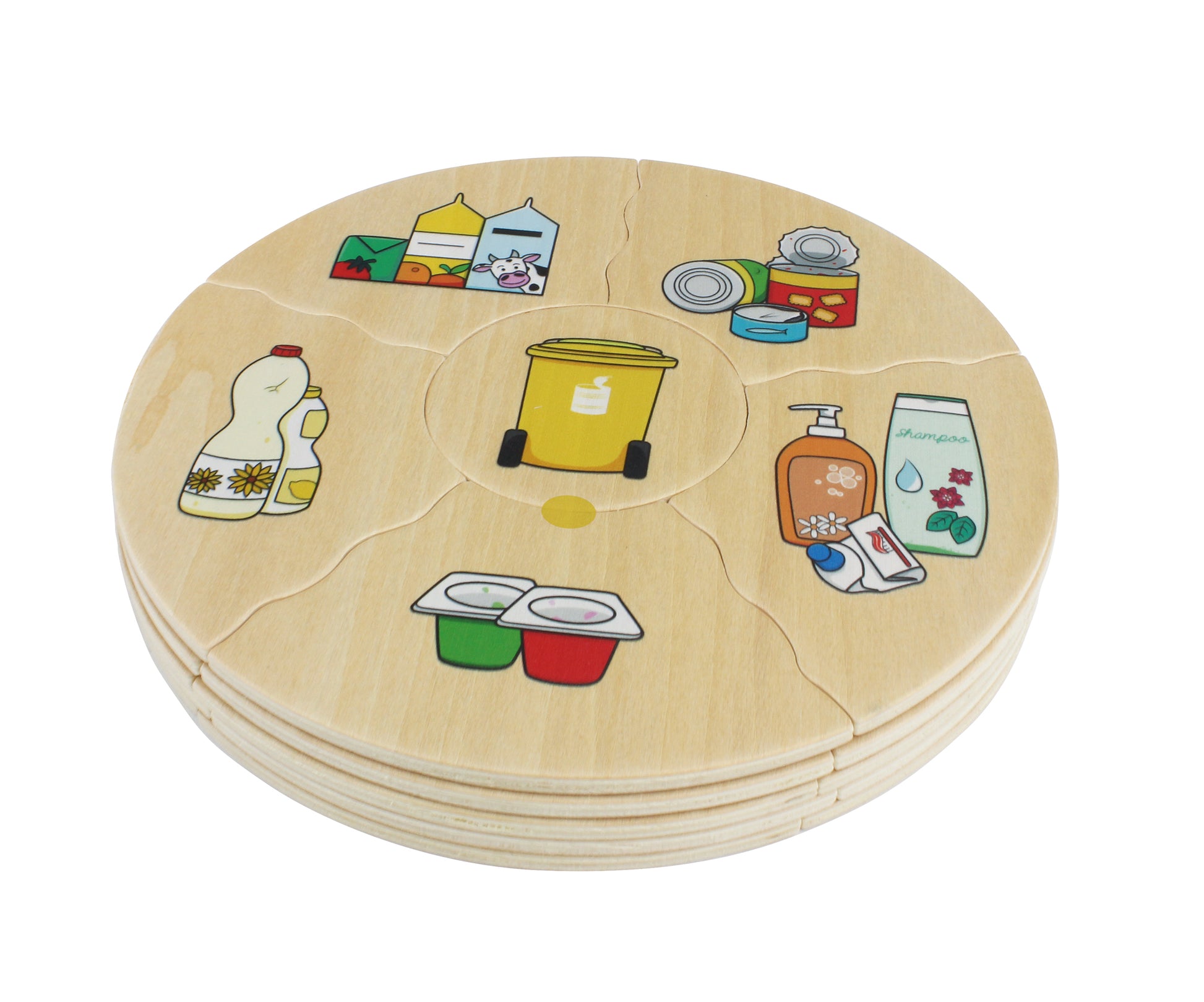 With this puzzle children learn about recycling and correct waste separation in a playful way. What do I dispose in what waste and how should waste be separated? The playful way of dealing with the classification into organic, plastic, residual, paper and special waste is