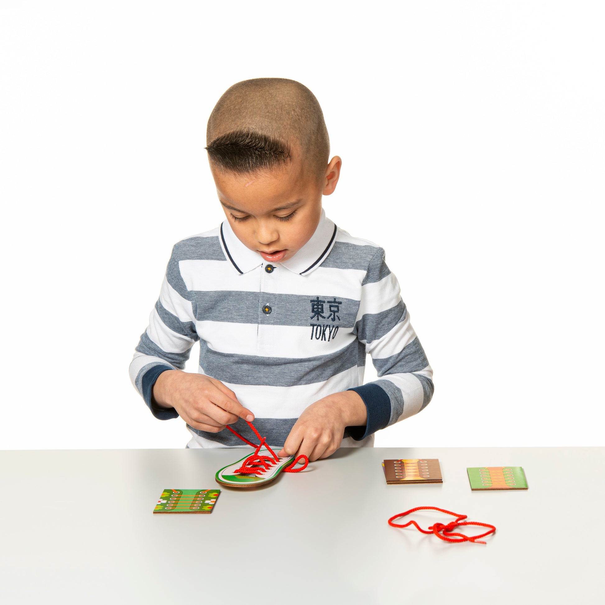 Lace the shoes. Either copy the example card or come up with your own patterns. Practice fine motor skills by threading the laces. Carefully look to the left, right, up, and down, in order to practice spatial awareness.