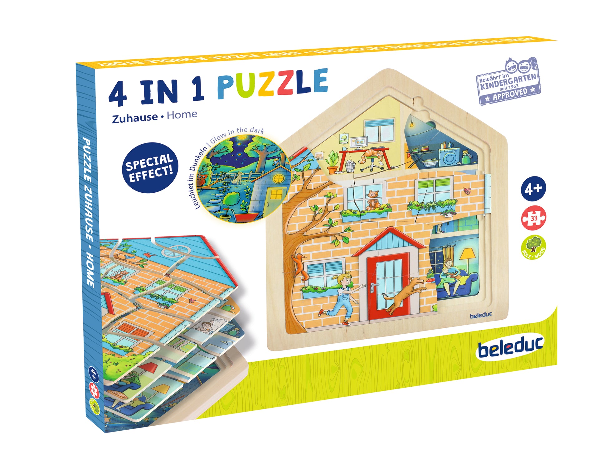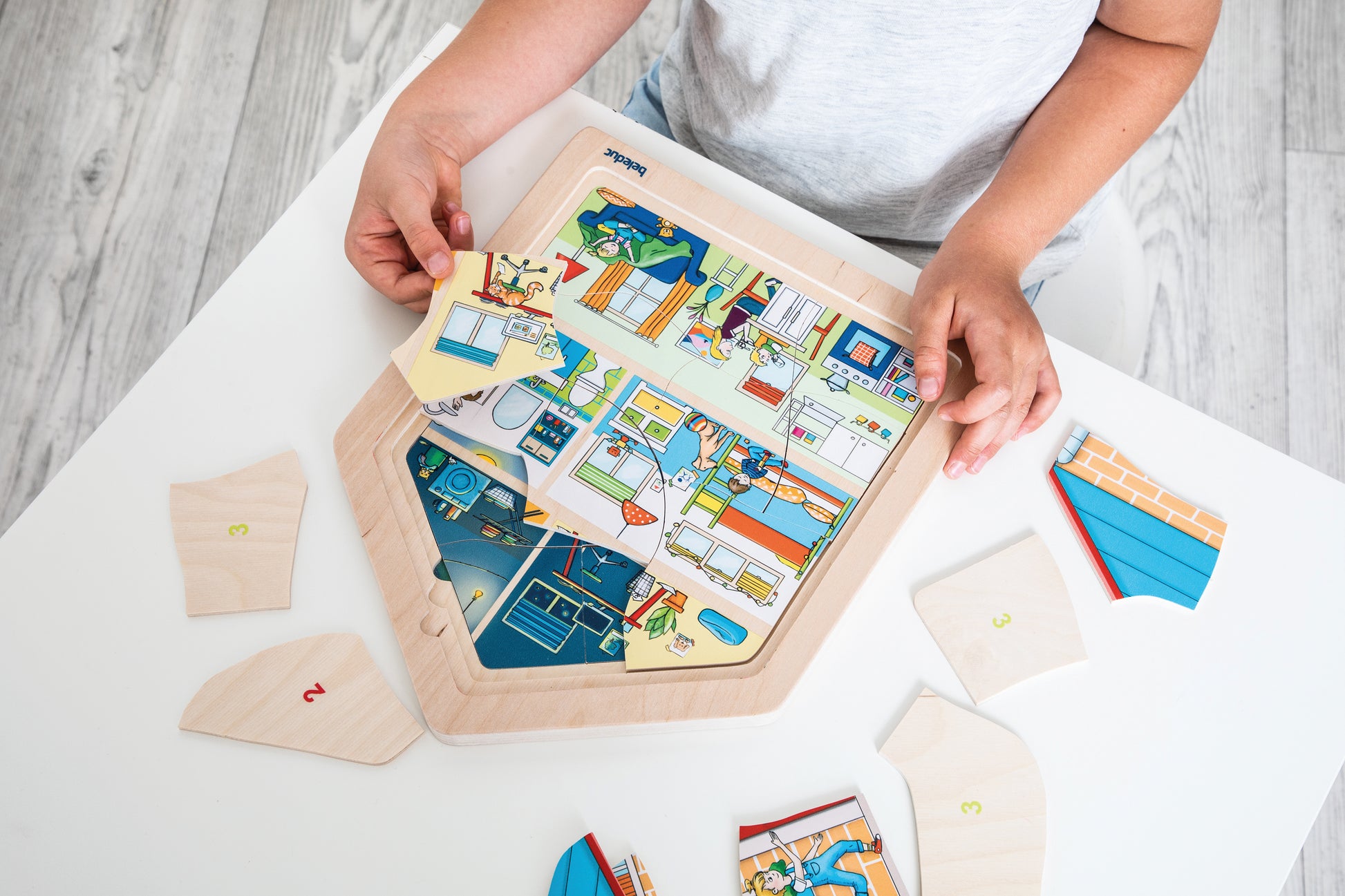 Who lives here? Look inside the house and follow the family’s activities. What is there to discover in the different rooms by day and by night? This exciting layered puzzle made from wood promotes the child’s matching abilities and imagination, as well as concentration.