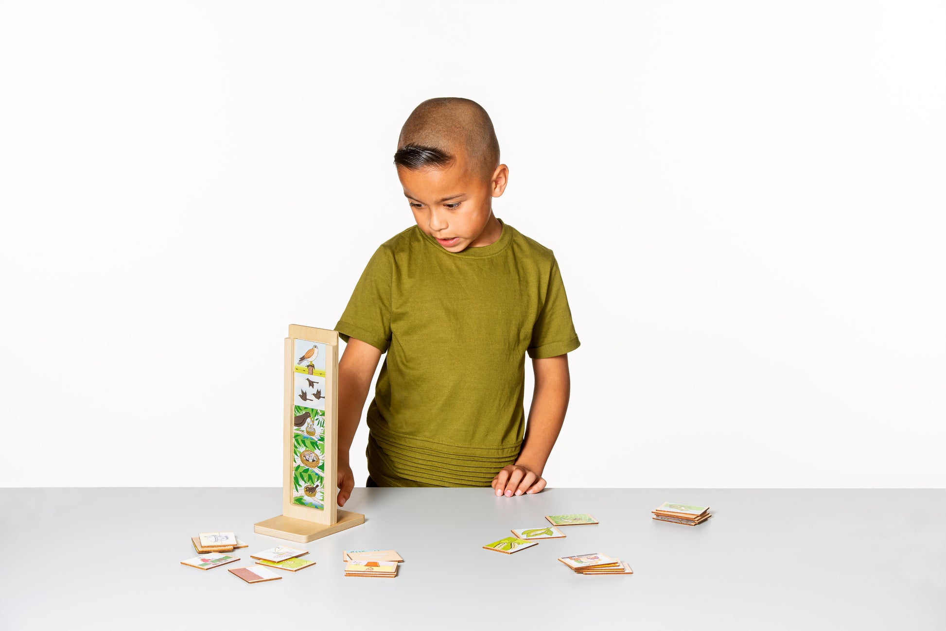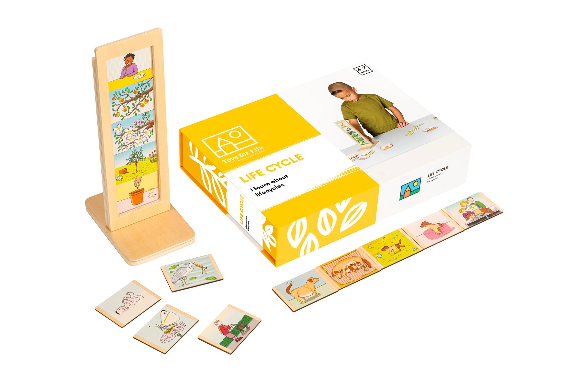 Place the life cycle in the right order in the wooden stand. The set includes the life cycle of man, dog, wasp, butterfly, frog, bird, flower, carrot, apple and rice.