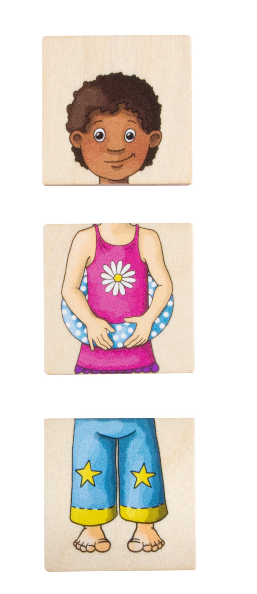 The children are puzzled according to their characteristics or funny fantasy kids can be created. Combining of heads body parts and legs. Recognising and assigning of different characteristics.