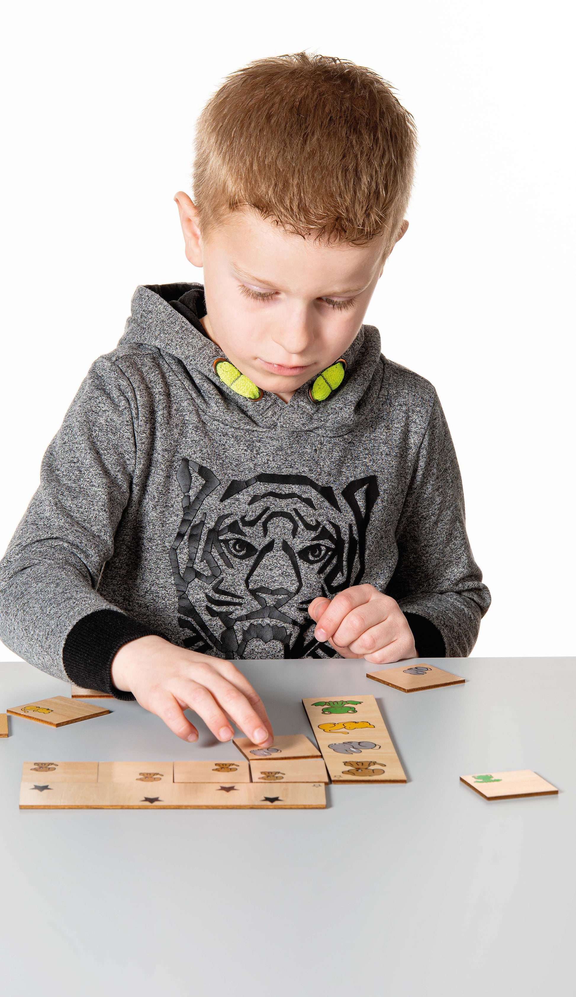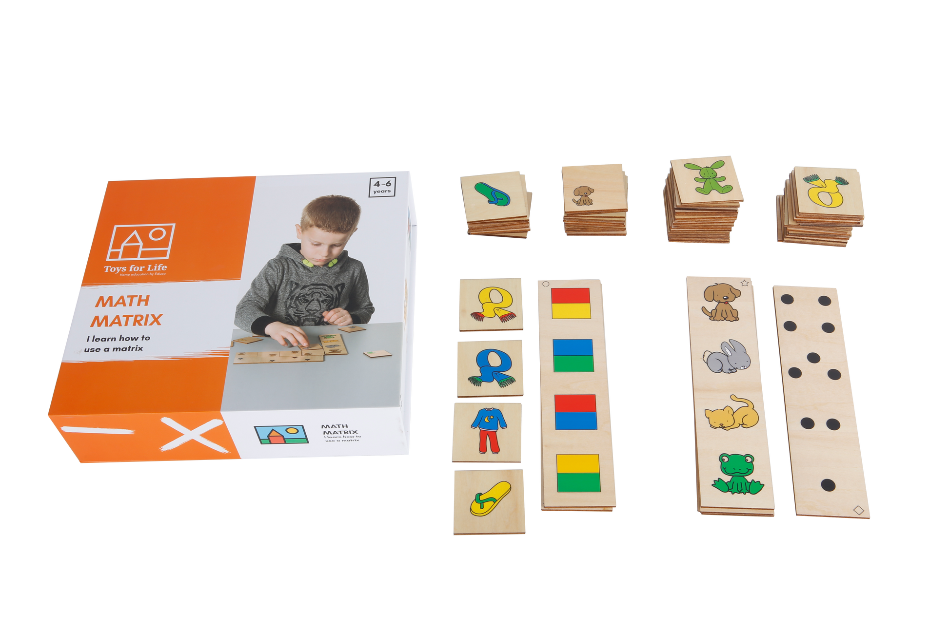 Practice spatial orientation by sorting the image cards into their respective places on the matrix. Learn about size, position, colour combinations, and quantities.