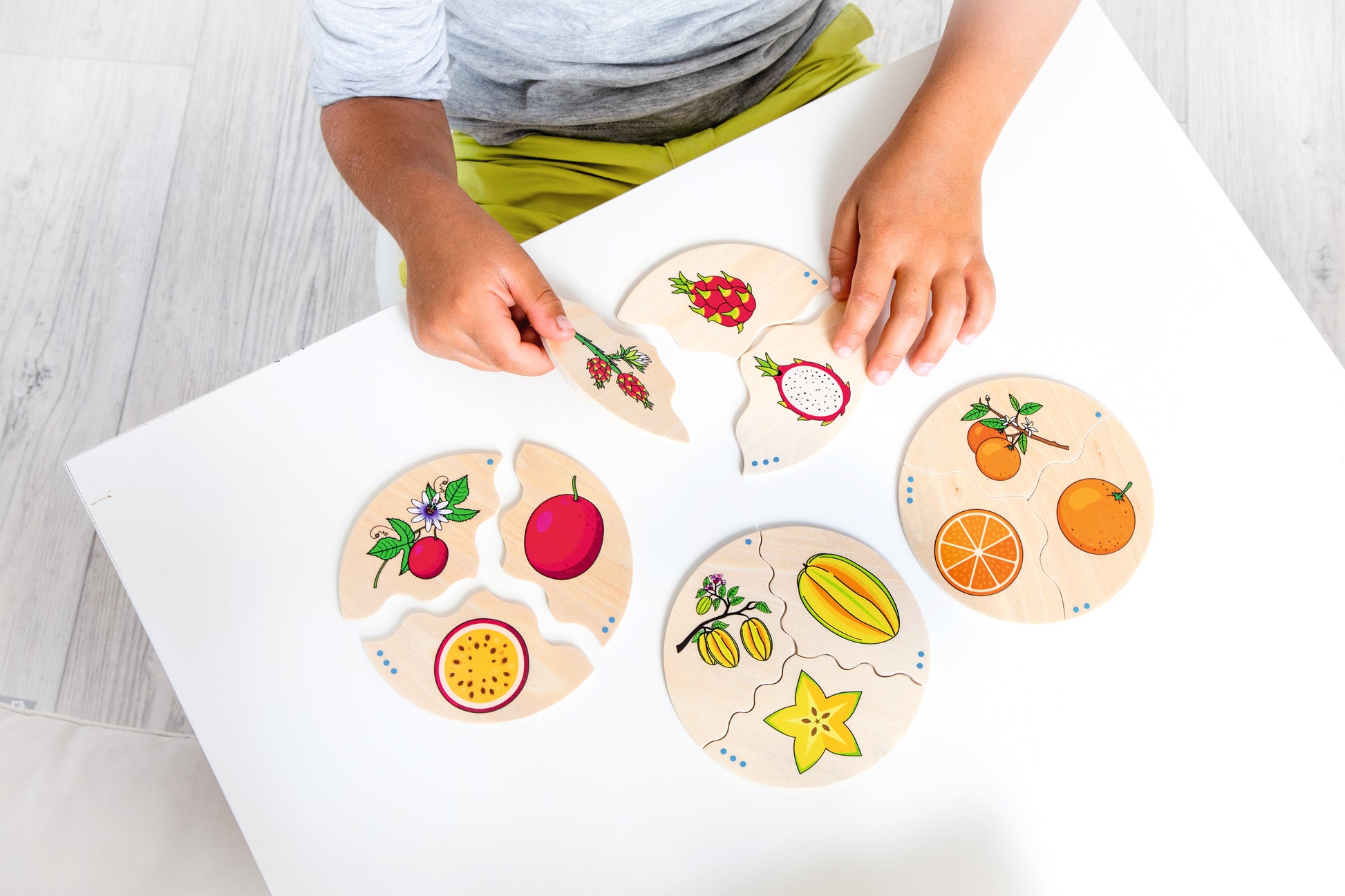 How does a kiwi grow? What does a passionfruit look like from the inside? With our 3-part puzzle, the children get to know 10 different fruits – from the plant to the ripe fruit ready for consumption.