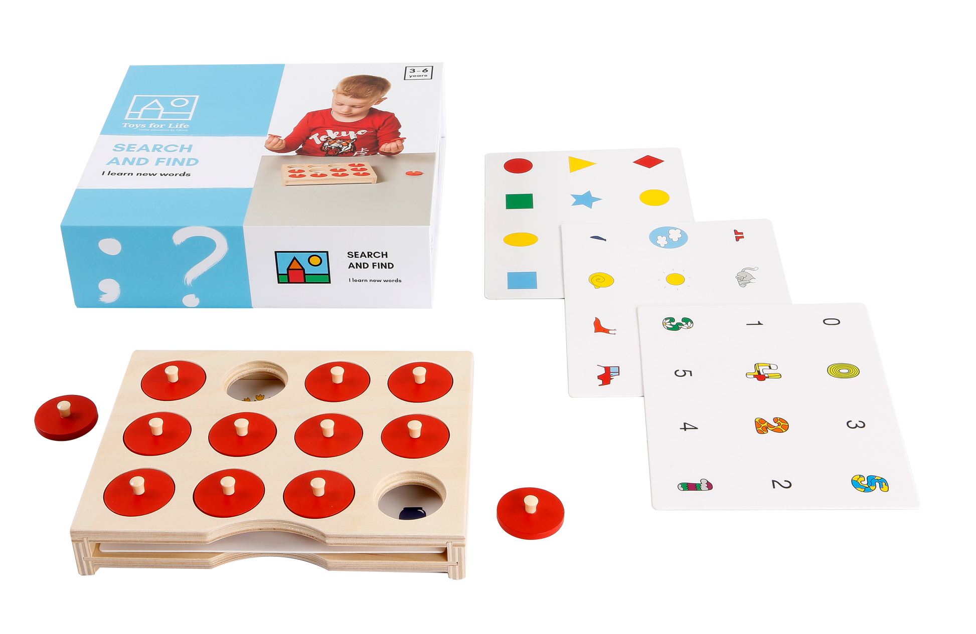 Insert one assignment card into the game box upper shelf and try to find the related pairs by lifting the red discs. Develop hand-eye coordination, spatial insight and visual discrimination.