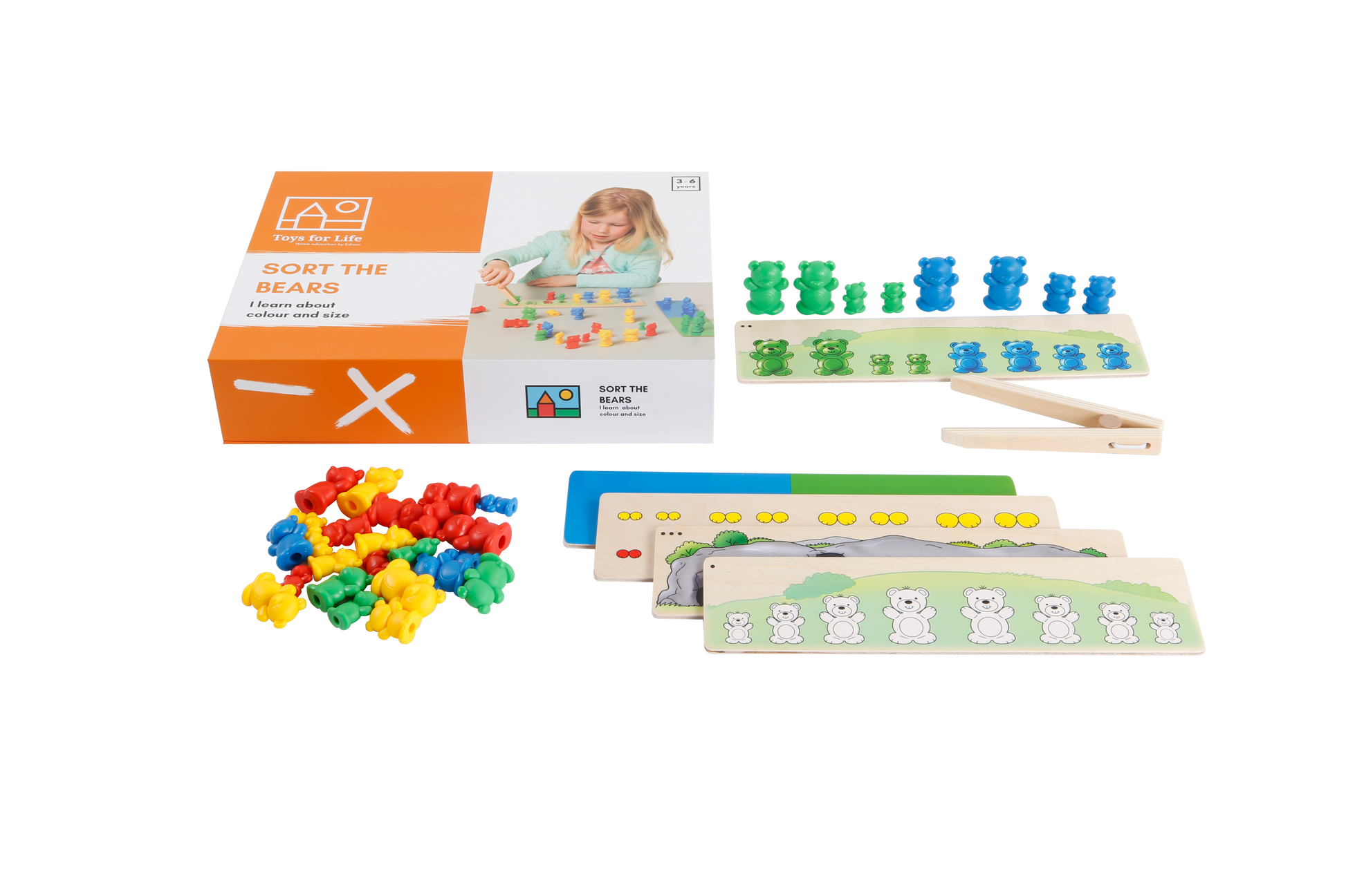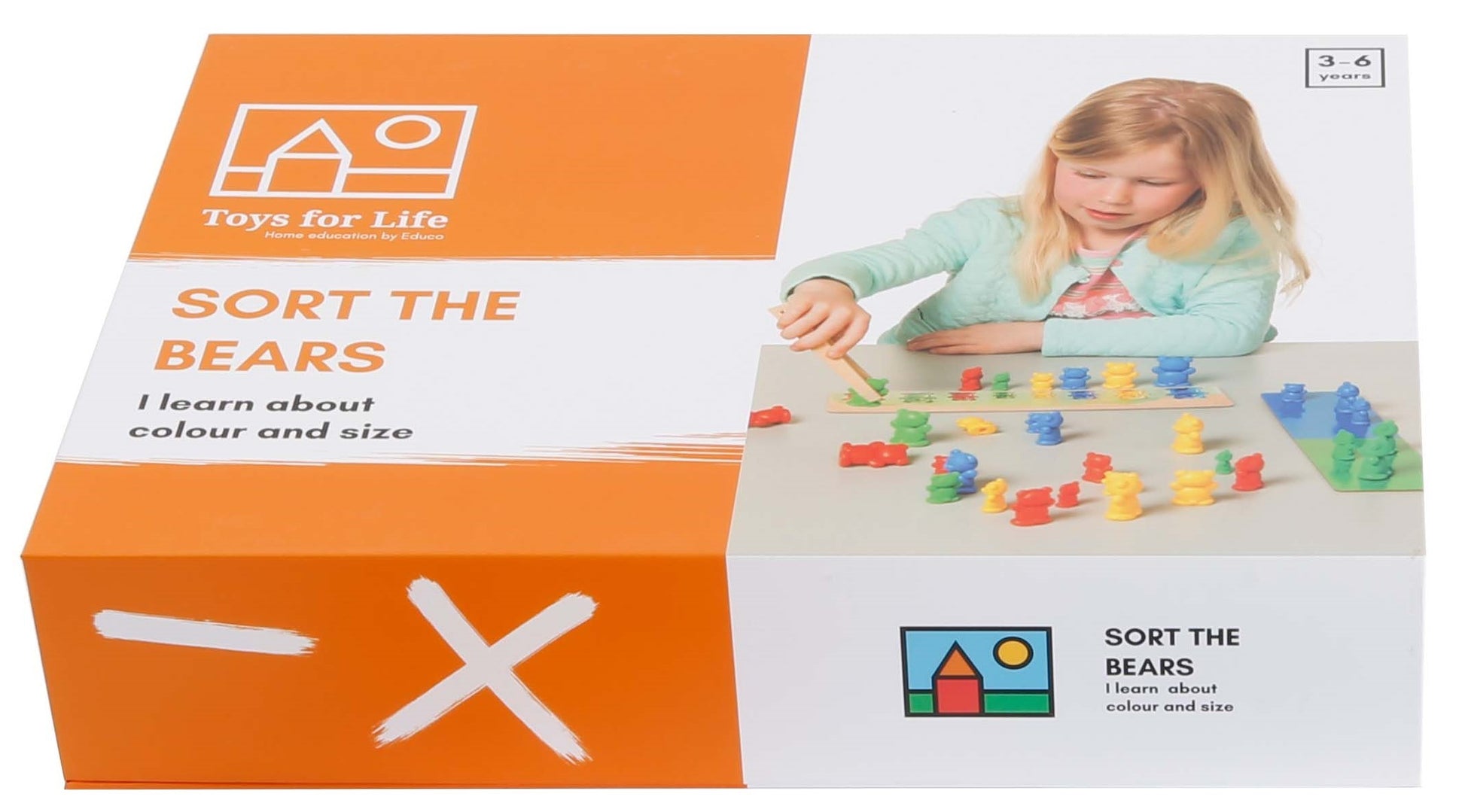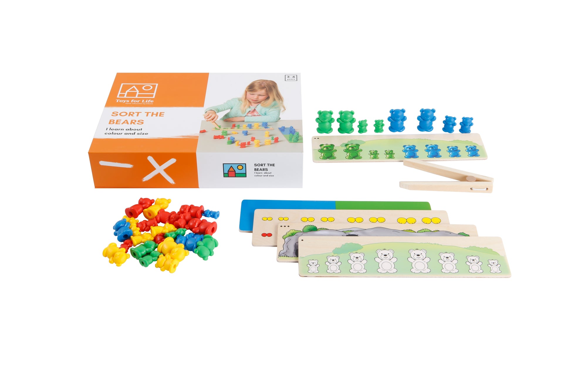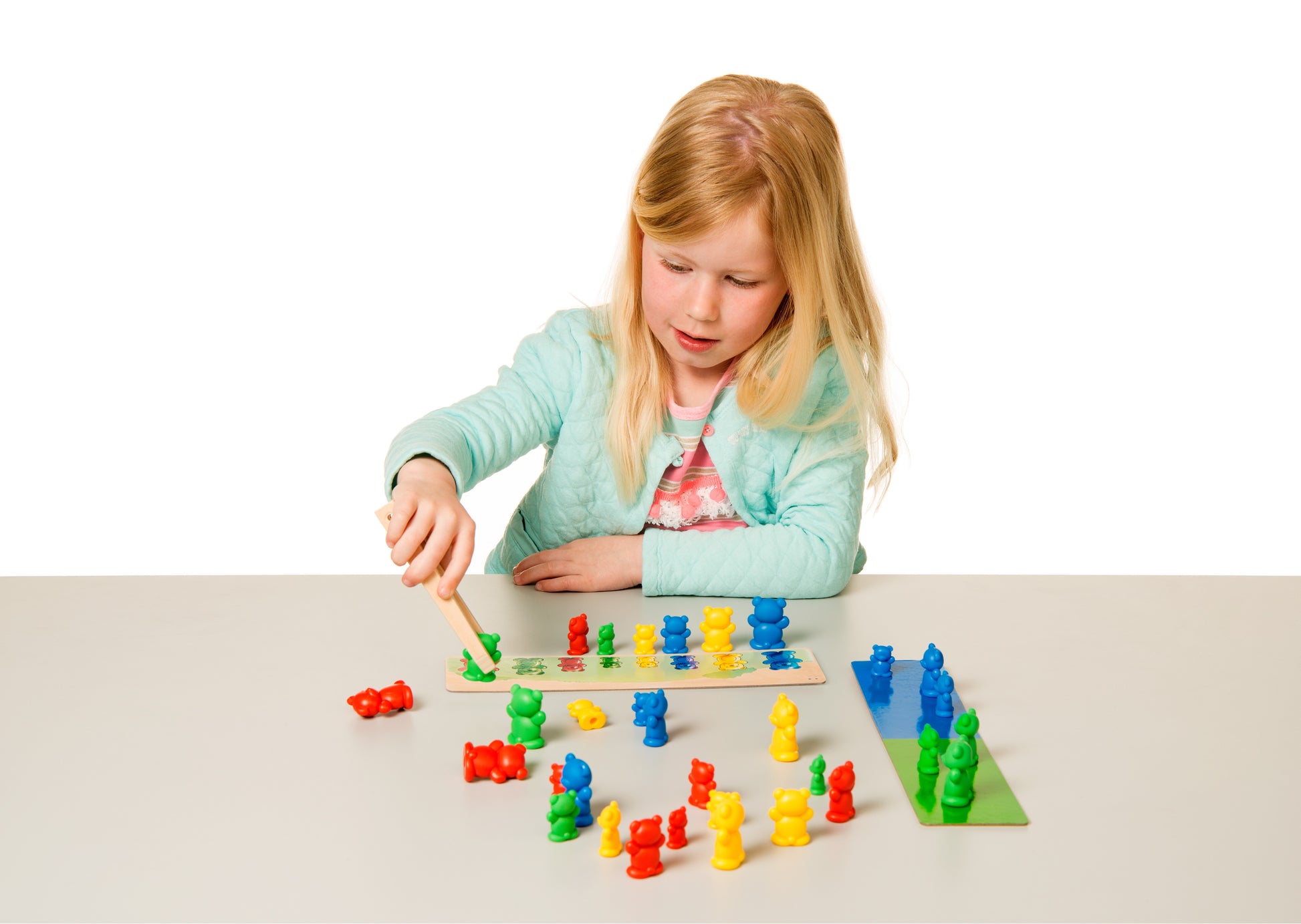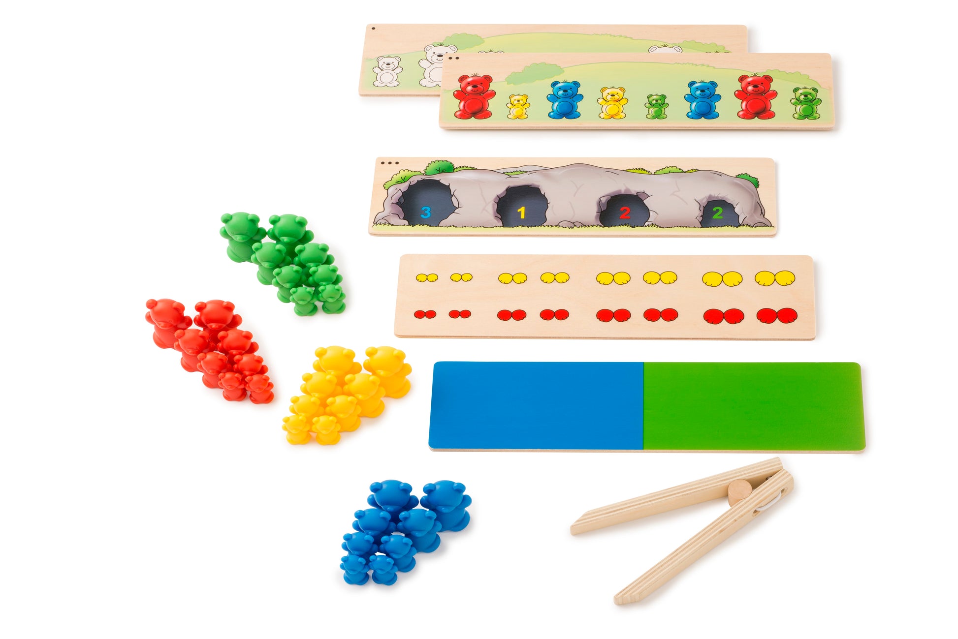 Place the bears with the same colour and size in front of the assignment card. Use the tweezer to develop fine motor skills.