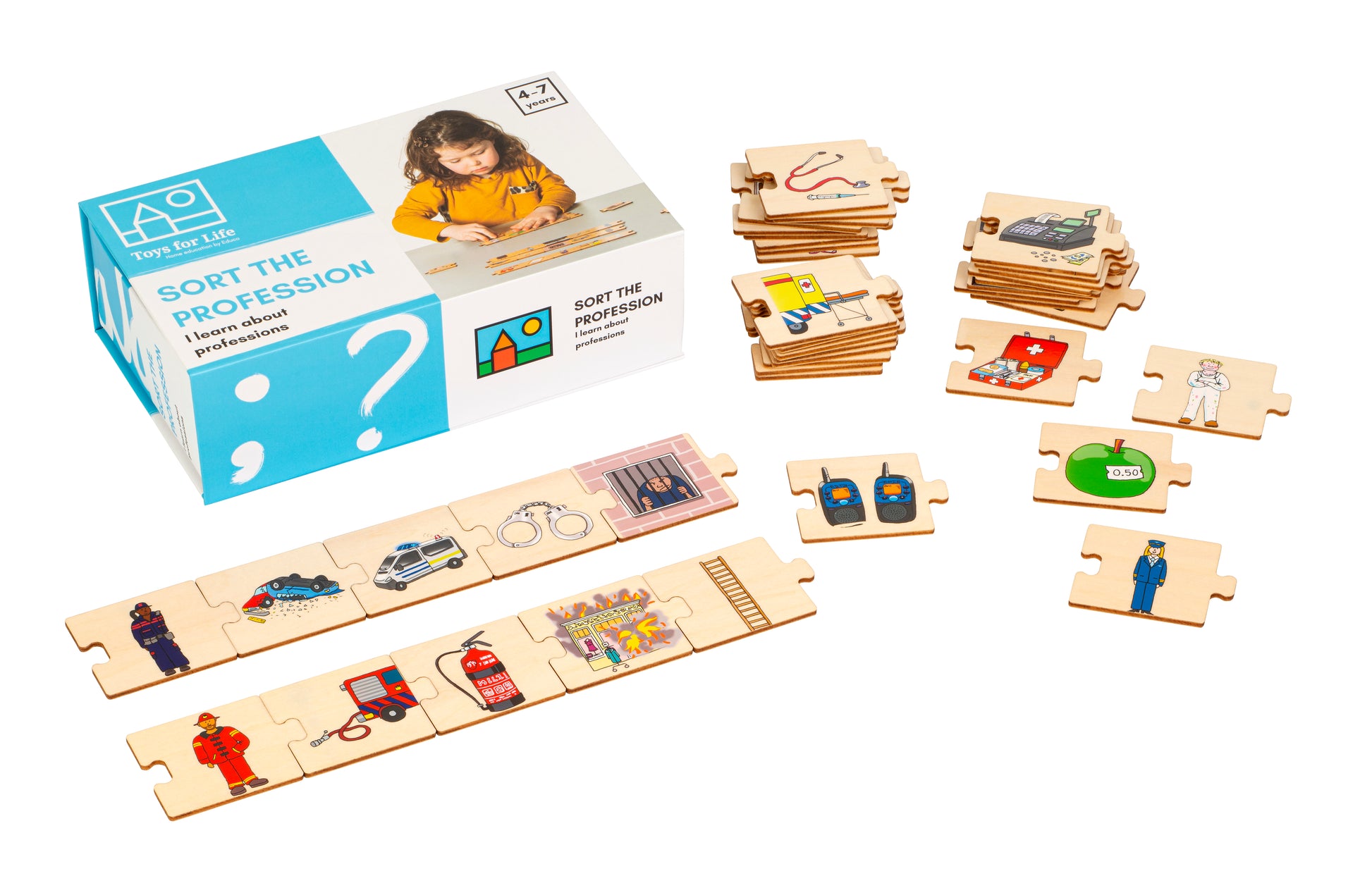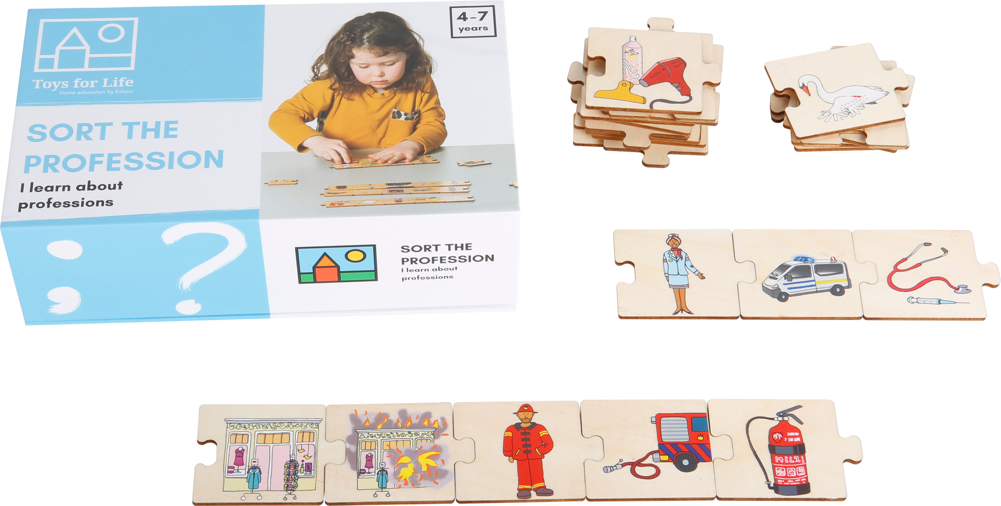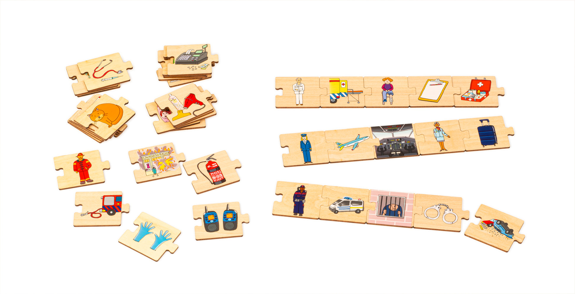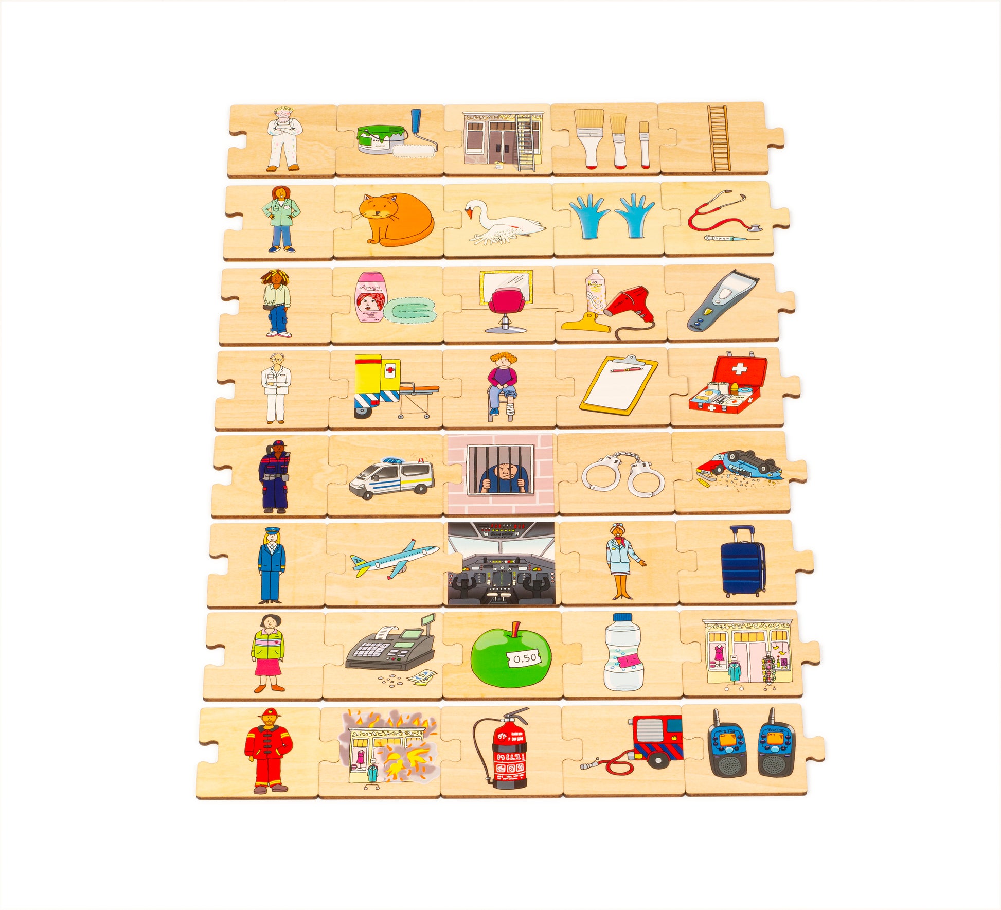 Match the puzzle pieces with their corresponding occupations. Learn about occupations and practice vocabulary and fine motor skills. The puzzle pieces can be combined in any way, allowing for many different stories to be told.