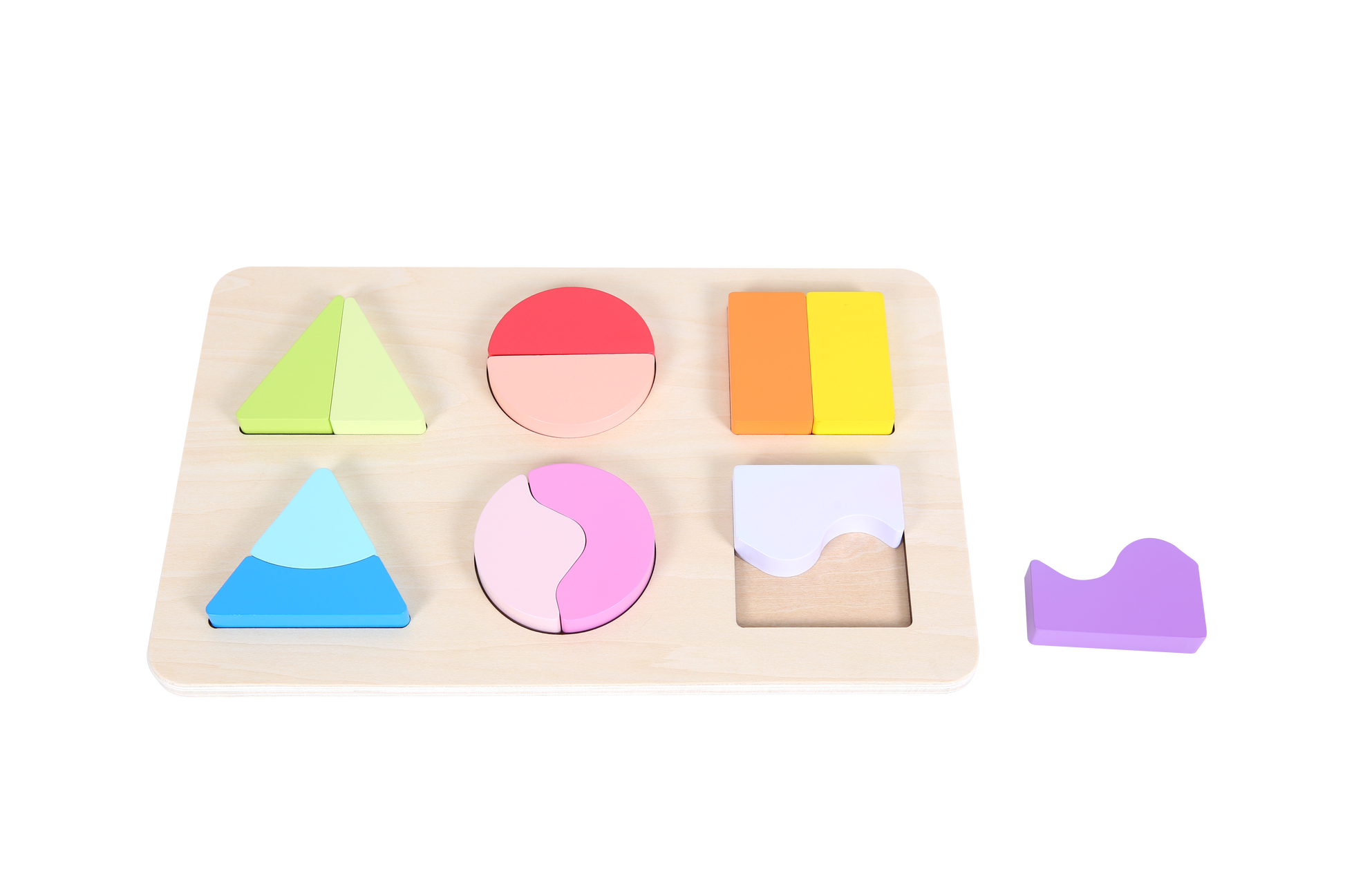 This shape puzzle uses the three common geometric shapes triangle, square and circle. By putting the shapes together, children learn that individual parts make a whole. It also encourages baby's attention and problem-solving skills, and develops fine motor skills and hand-eye coordination.