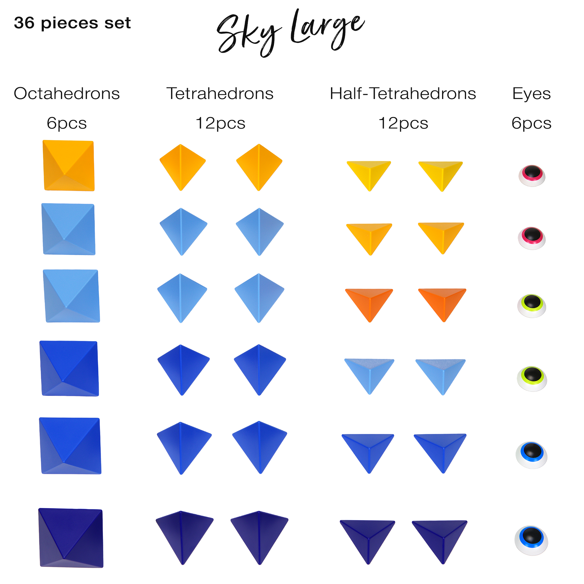 The 36-Pieces Set includes: 6 octahedrons, 12 tetrahedrons, 12 half-tetrahedrons, 6 eyes (in total 36 pieces) + Leaflet + Limited Edition "Inspiration Book"